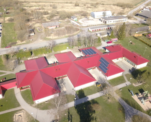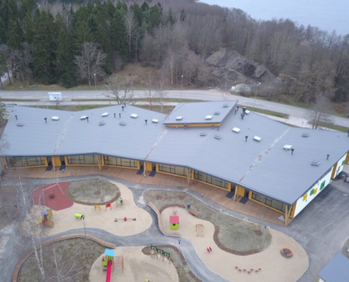 2018 – Lasteaia aluskatte ja roovi tööd, klassik profiilpleki paigaldus, 2500m2 vihmaveesüsteemid, lumetõkked